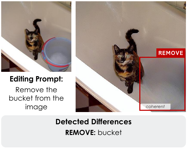 The coherence estimation module in DICE evaluates whether each detected object-level change aligns with the user's editing instruction. It builds upon the same MLLM architecture as the difference detector and takes as input the original and edited images, the localized bounding box of the change, and the associated modification type. The model outputs a binary decision (YES/NO) along with a textual rationale, determining if the modification is semantically consistent with the prompt.