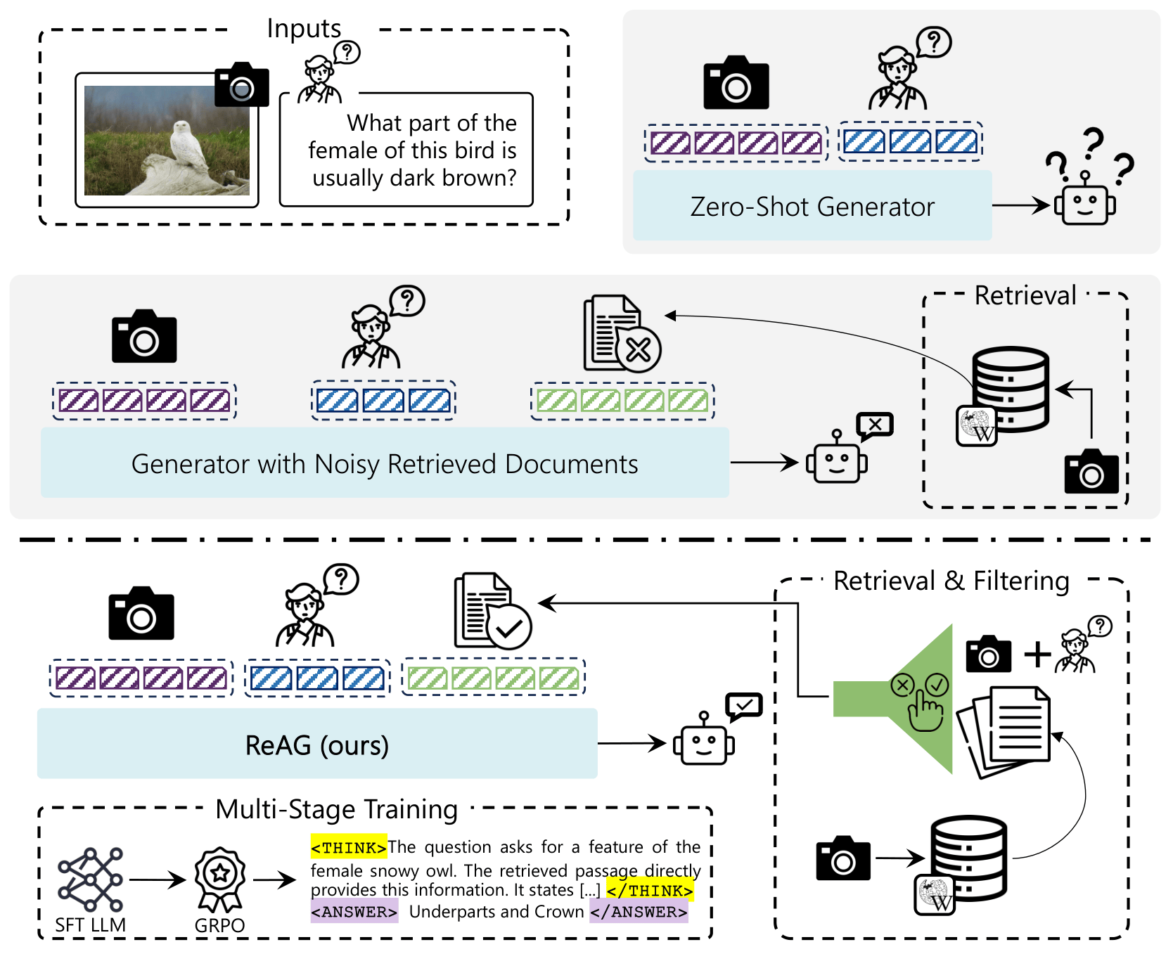 Figure 1. Comparison between Zero-Shot MLLMs, retrieval-augmented models, and ReAG.