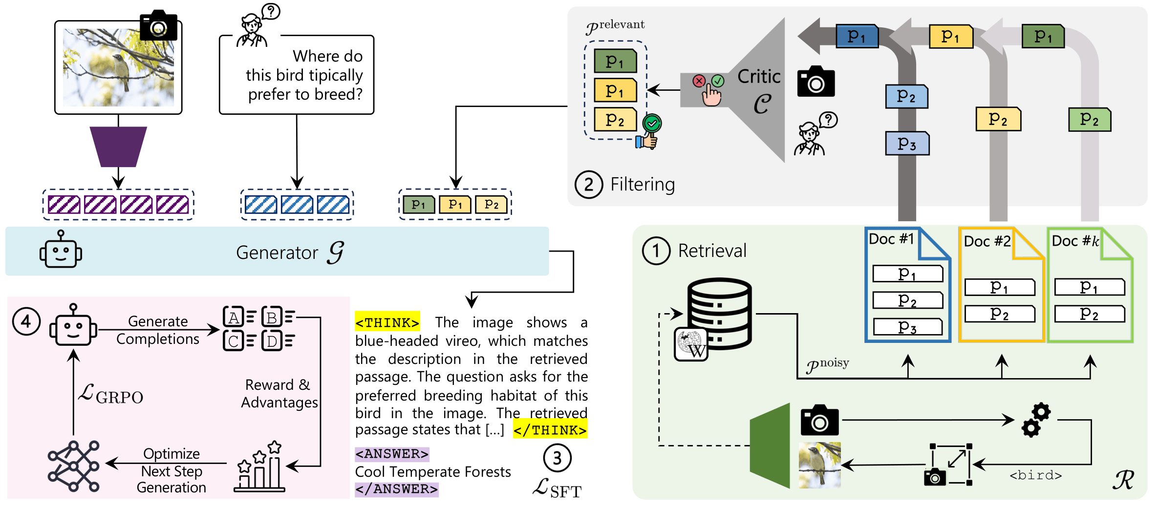 Figure 2. Overview of the proposed ReAG model. Multi-level retriever → critic filtering → SFT cold-start → RL training.